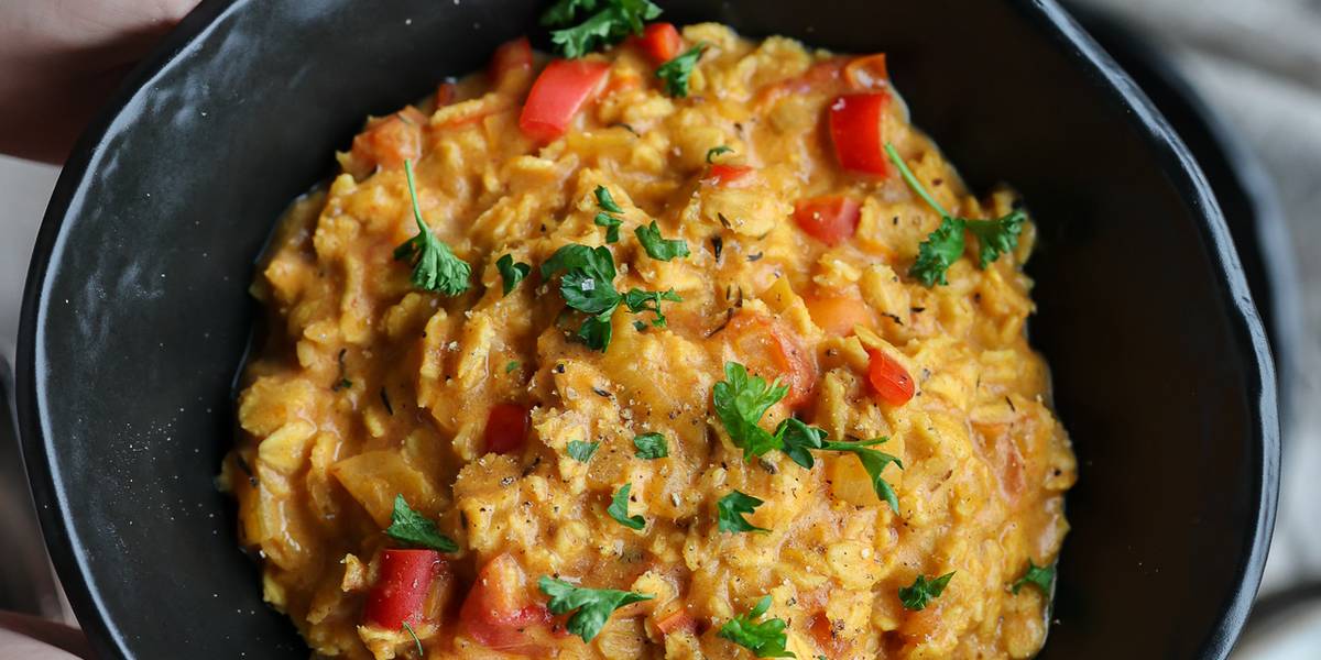 Jollof rice is a well-loved West African dish made with rice, tomatoes, onions, and spices, with different variations across countries like Nigeria and Ghana. Inspired by those bold and comforting flavours, we created Jollof Oats – definitely not authentic, but a fun twist on the concept! This savoury breakfast combines oats with tomatoes, chilis, onion, and red bell pepper, bringing a rich and slightly spicy depth. The addition of curry powder enhances the warm, aromatic notes, while the tomatoes make it extra juicy. It’s a great option for when you’re craving something savoury and warming to start your day.