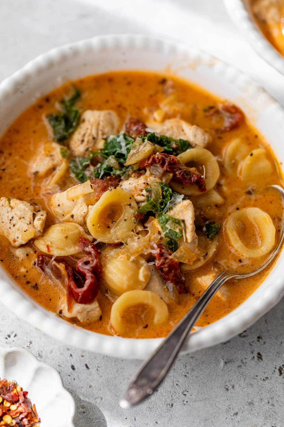 I love this dish so much that I just had to transfer those flavors to a luxurious, winter-ready soup! My Marry Me Chicken Soup recipe simmers chicken, sun-dried tomatoes, pasta, and kale together in a luscious, cheesy broth. It has everything I love about the classic version, plus you can curl up with a bowl on the couch.