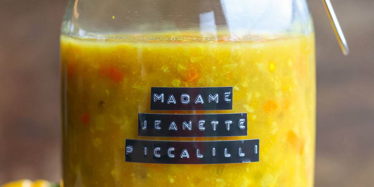 This Madame Jeanette Piccalilli is a fiery, tangy twist on the classic, with bold heat from Madame Jeanette peppers and a savoury-sweet vinegar base. Popular in Surinamese cuisine, it’s the perfect accompaniment to roti, rice, or grilled veggies, adding spice, crunch, and citrusy zing to your meal.
