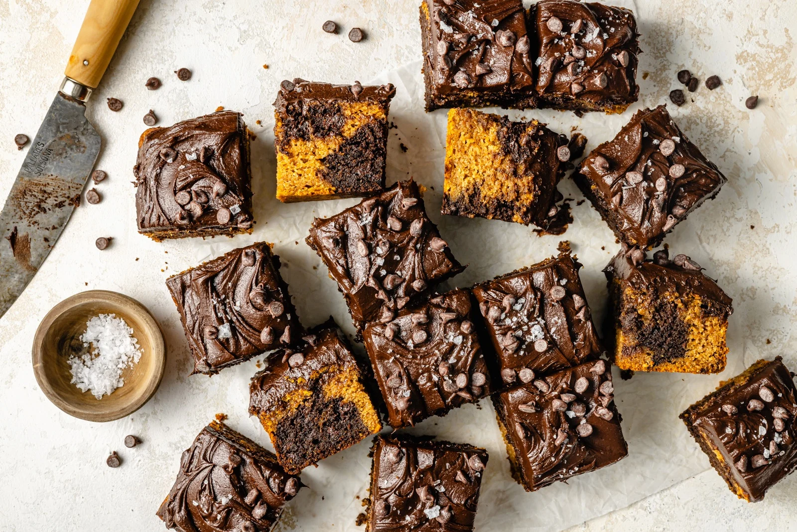 Layer the batters and marble: Use a medium cookie scoop to grab a scoop of the pumpkin batter and place in the pan, then alternate and scoop up some chocolate batter and place it next to the pumpkin batter at the bottom of the pan. Once the pan is completely covered with batter on the bottom you can gently shake/shimmy and tap the pan to settle the batter. Do not smooth it out just yet. Next, do an additional layer of each batter on top of the first marbled layer. Once you have used up all of the batter, you can tap and shake the pan, then smooth the top out with a spatula. Using a butter knife, gently swirl the mixture back and forth (in a zig-zag pattern) both vertically and horizontally. (I like to draw a few figure 8s in the batter and then be done with it.) Don’t go too crazy or the batter won’t look nice and swirled! Gently tap and shake the pan again to smooth out the batter.