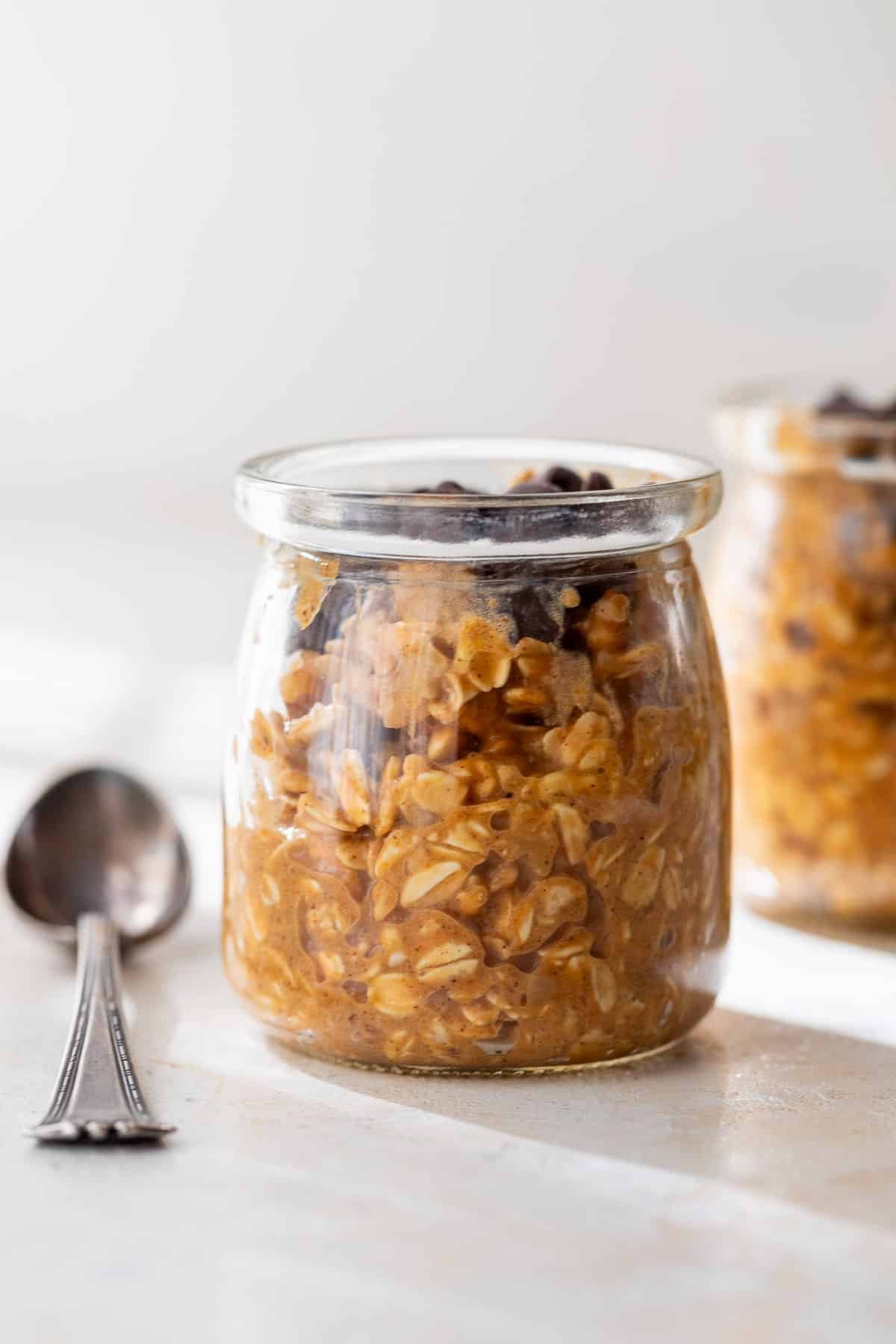 close up on pumpkin overnight oats in a glass jar next to a spoon.close up on pumpkin overnight oats in a glass jar next to a spoon.