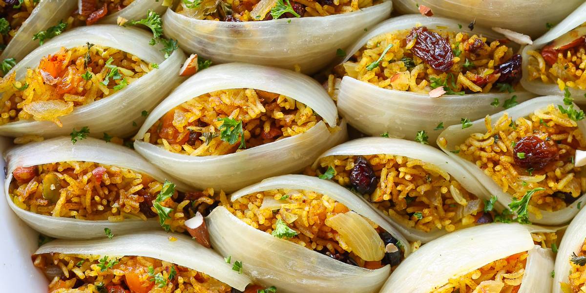 These yellow rice-stuffed onions are an eye-catching dish, perfect for any occasion. The onions, tender yet firm, are filled with basmati rice infused with aromatic spices like saffron, cinnamon, and cumin. A mix of dried fruits adds a subtle crunch and a hint of natural sweetness, while the golden hue of the rice makes them a stunning addition to your table.