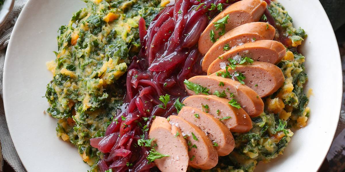 Boerenkool stamppot is a hearty Dutch winter classic, made with kale and potatoes, we added a little twist by adding sweet potatoes as well. The caramelized onion gravy adds a sweet, savoury and tangy burst to every bite. Served with smoky vegan sasuages, this dish is a true taste of Dutch comfort food.