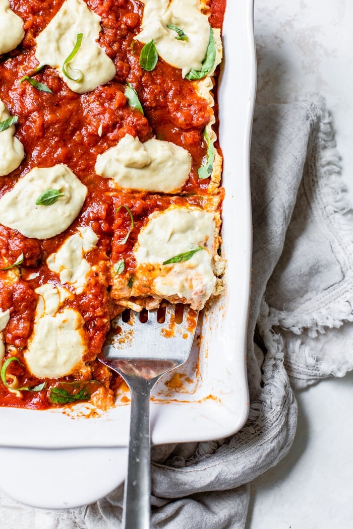 Vegan mozzarella cheese – It just wouldn’t be lasagna without a layer of ooey gooey dairy-free mozzarella cheese on top. I used store-bought shredded “cheese.” Dollops of my homemade vegan mozzarella would be delicious, too!