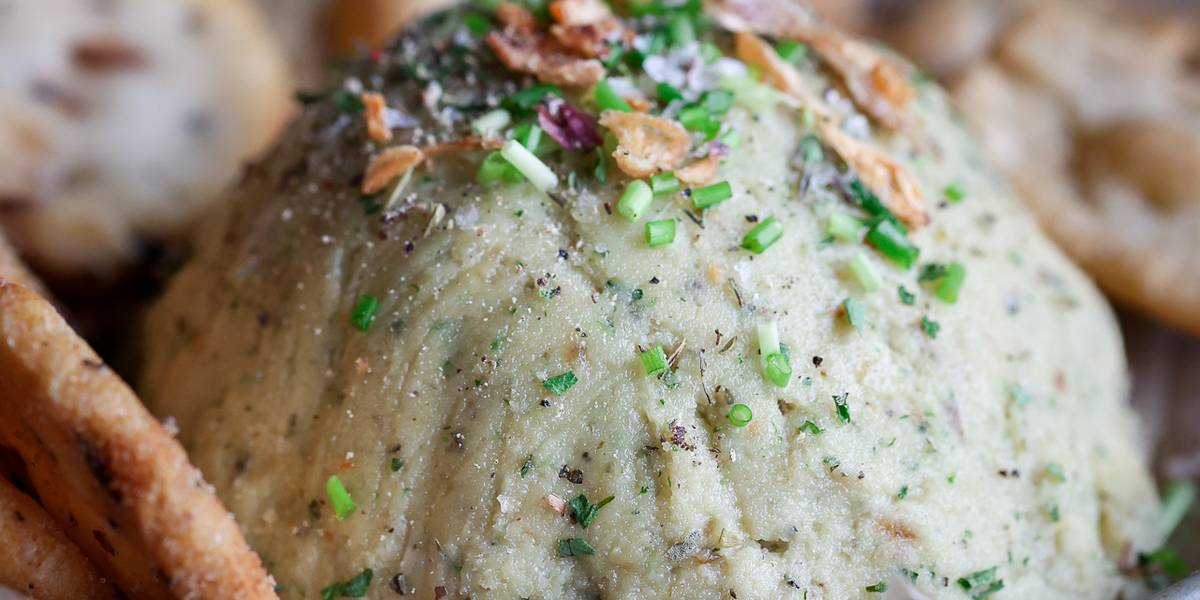 This cashew cheese spread was inspired by Boursin, but it has its own unique twist. We combined creamy cashews with a touch of yogurt for a rich and tangy base, then added fresh chives and crispy fried onions for extra depth of flavour. Perfect for spreading on crackers or adding to a festive cheese board!
