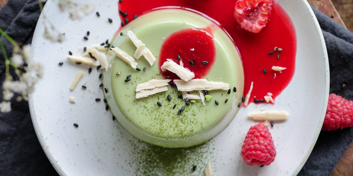 This vegan panna cotta is the perfect example of how matcha and white chocolate bring the best out of each other. Topped with a luscious raspberry coulis, this simple recipe looks like a labour of love, but is actually a breeze to make!