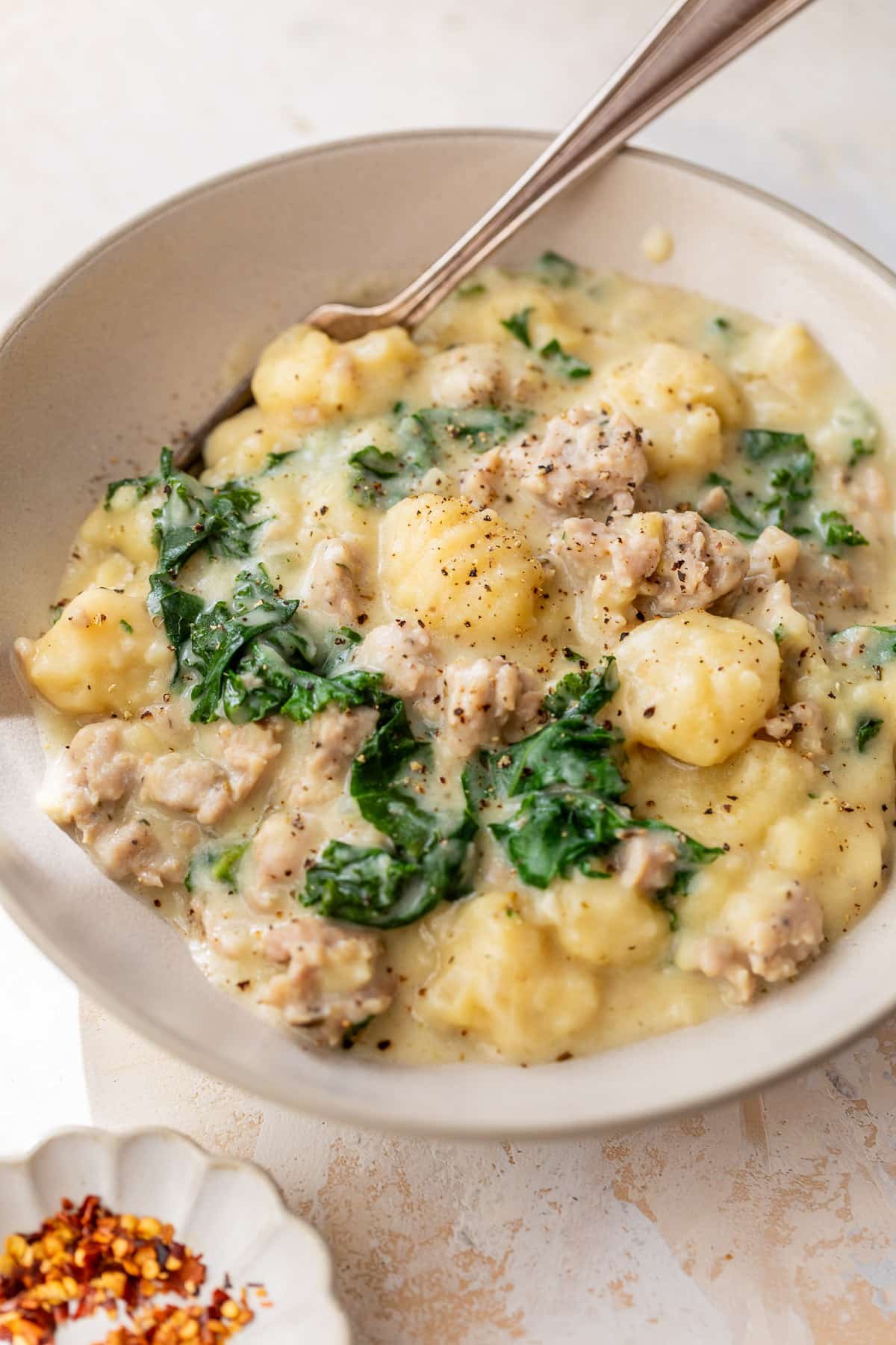 Like Zuppa Toscana – Just like Olive Garden’s iconic Zuppa Toscana, this cozy, creamy meal simmers browned Italian sausage and kale in a Tuscan-inspired cream sauce. The only difference is I used pillowy gnocchi instead of potatoes!
