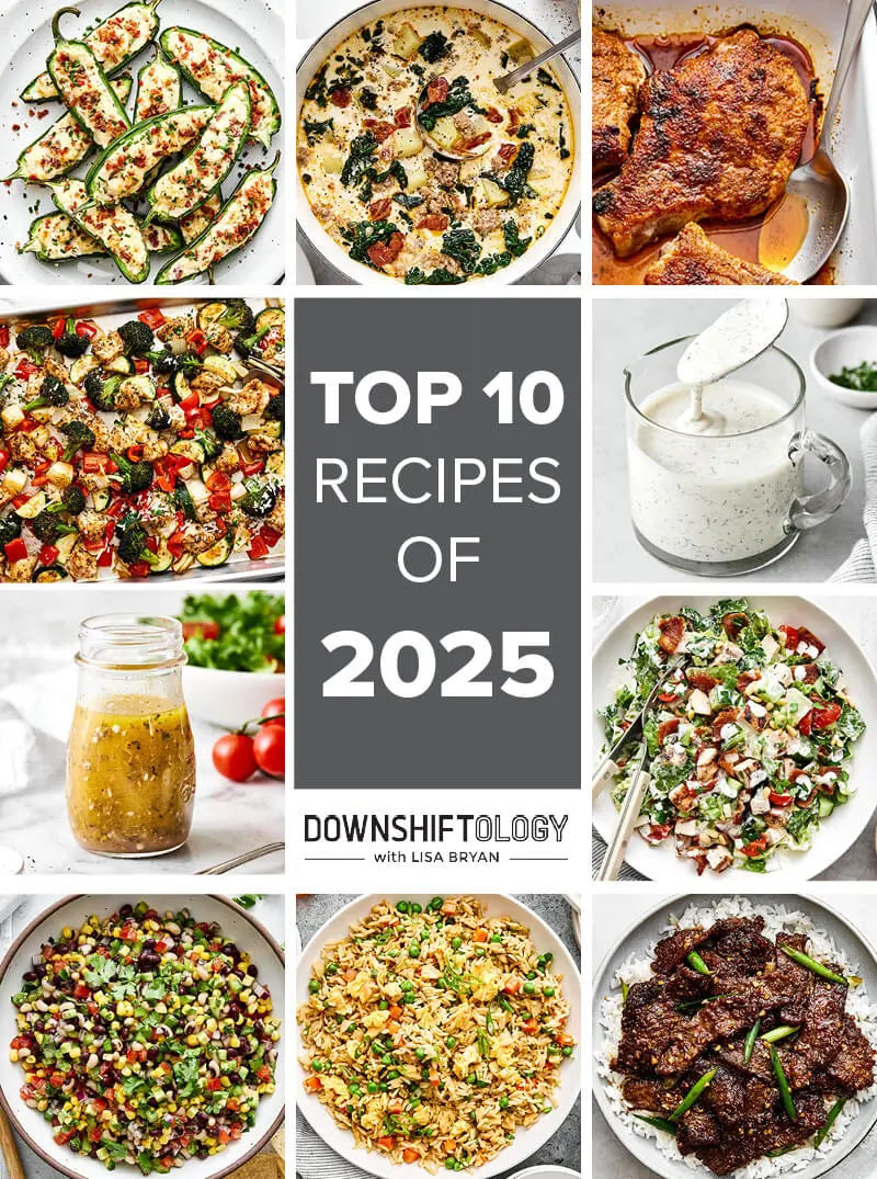 The top 10 recipes on Downshiftology this year leaned towards high-protein, with a few restaurant copycats, and homemade dressings (so much better than store-bought). Plus, two party appetizers reigned supreme this year!