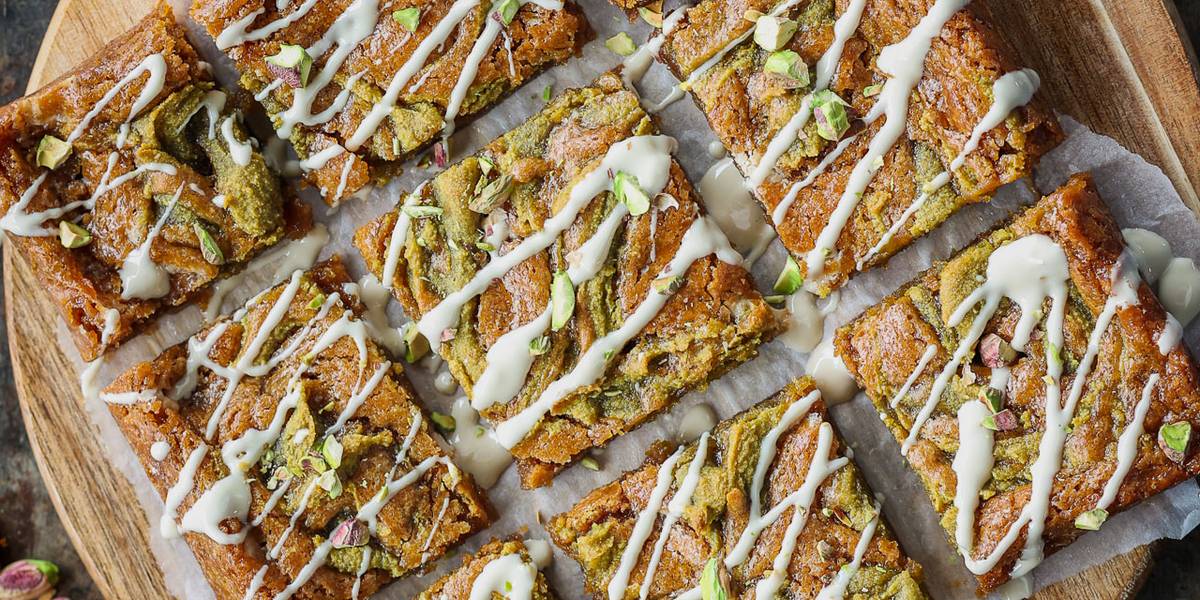 A blondie resembles a brownie in texture but boasts a rich and buttery flavour with a golden, blond colour. It’s a close cousin to the classic chocolate brownie, but without cocoa, resulting in a caramel-like taste. This blondie’s texture is dense and chewy, with a slightly crispy exterior and a moist, fudgy center. Rich white chocolate and swirls of pistachio crema take this treat over the top. So, sink your teeth into a blondie and savour the blissful blend of sweetness and chewy goodness that this delectable dessert has to offer.