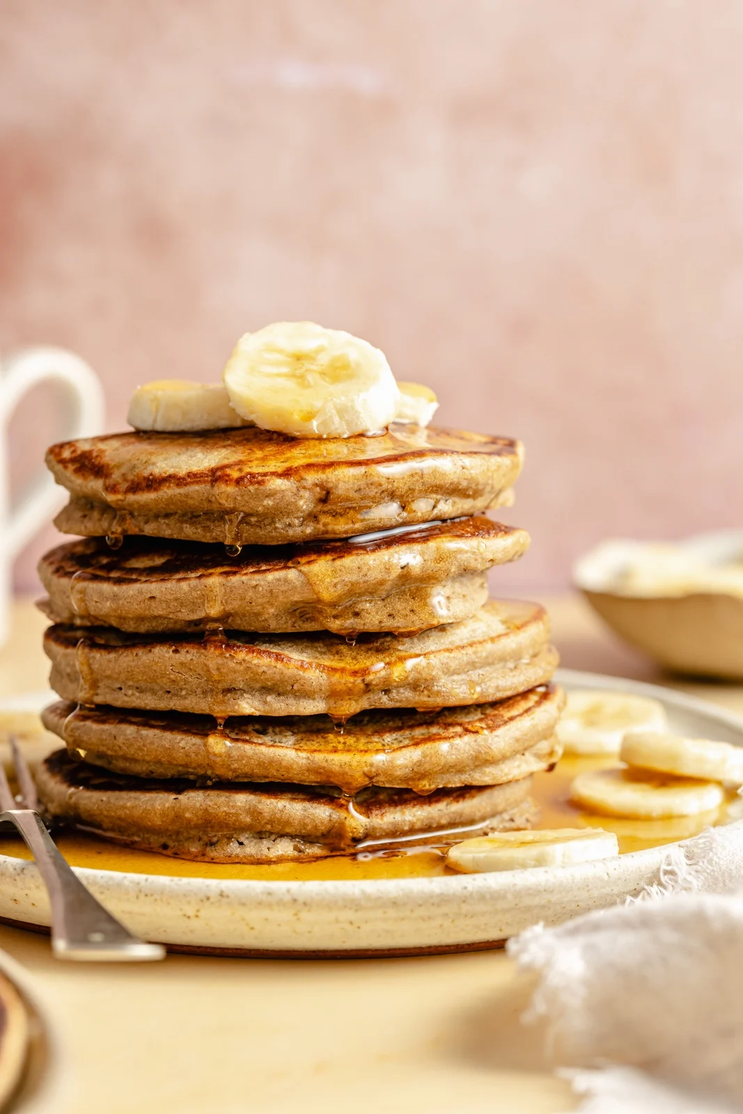The easiest banana oatmeal pancakes made right in the blender! These fluffy healthy pancakes are naturally gluten free, dairy free and contain no flour or added sugar. Get ready for a simple yet delicious breakfast!