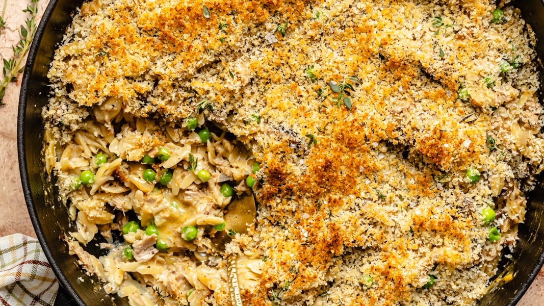 I’ve pretty much been orzo-obsessed for years now, and when I perfected the art of cooking it all in one pan with a bunch of yummy, savory ingredients, I knew it was a game-changer. This cheesy tuna orzo skillet has tender, savory mushrooms, fresh herbs, protein-packed tuna, and layers of gooey, melty cheese. Finish it off with a simple, crispy bread crumb topping, and your whole family might just be doing a happy dance.