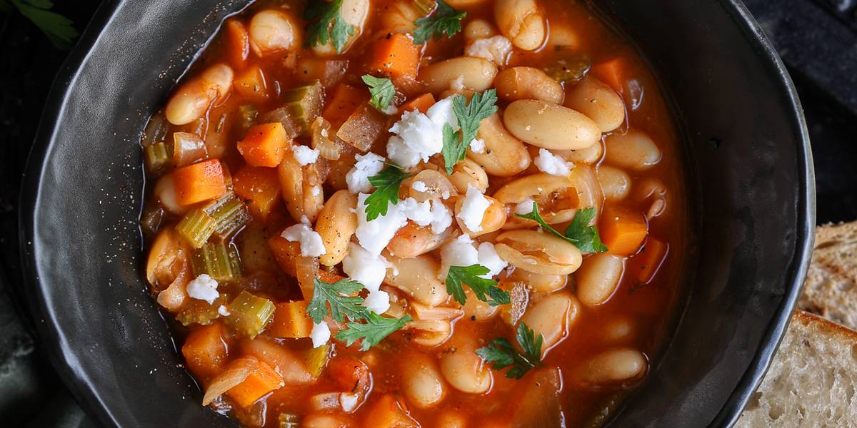Fasolada is a hearty, comforting, flavourful white bean soup from Greece. It is a celebration of simple, wholesome ingredients. Traditionally the white beans are slow-cooked with the rest of the ingredients, but we took some liberty here and used some pre-cooked white beans to make this come together more quickly.