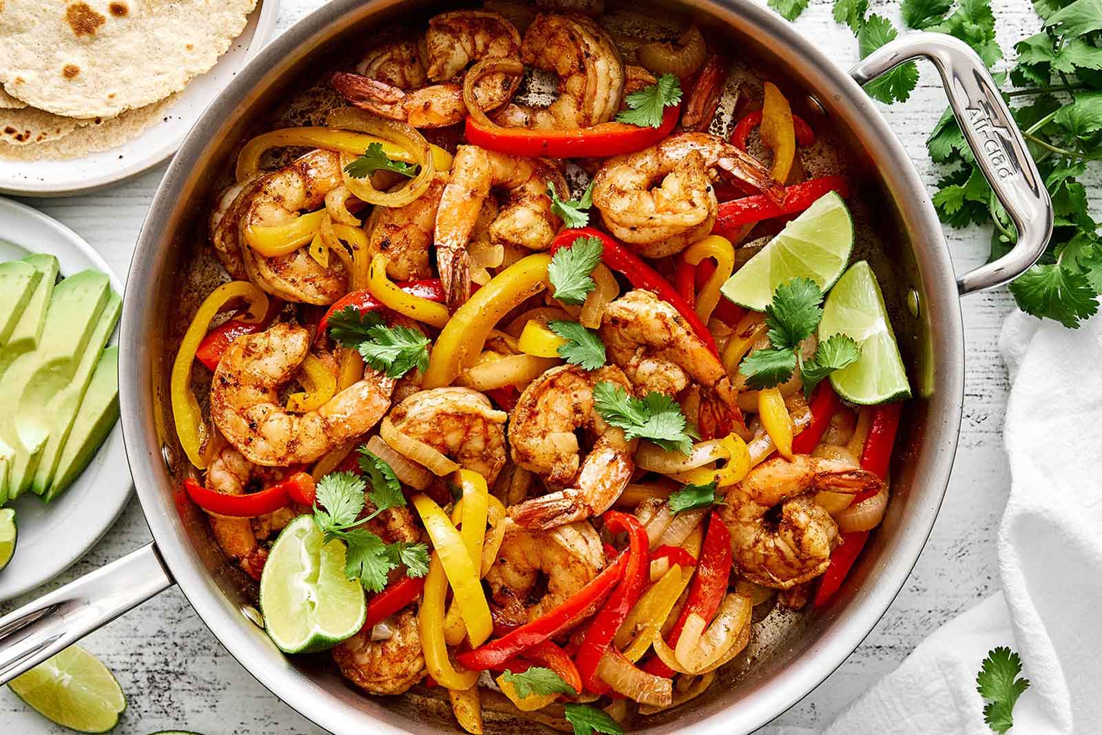 On busy weeknights, it’s always good to remember that shrimp fajitas cook quickly and pack in over 40 grams of protein! I love piling them into tortillas or serving them over lettuce for a lighter option. (41g of protein per serving)