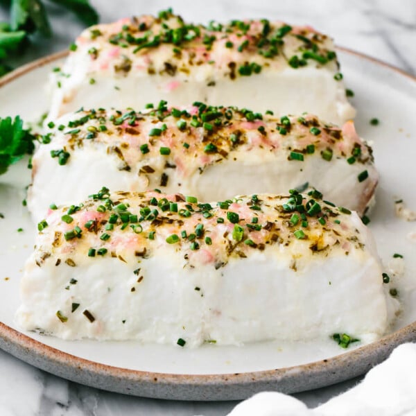 Don’t forget about halibut for a high-protein white fish! It cooks easily in the oven, and the herb mayo spread I put on top tastes oh, so good! (32g of protein per serving)