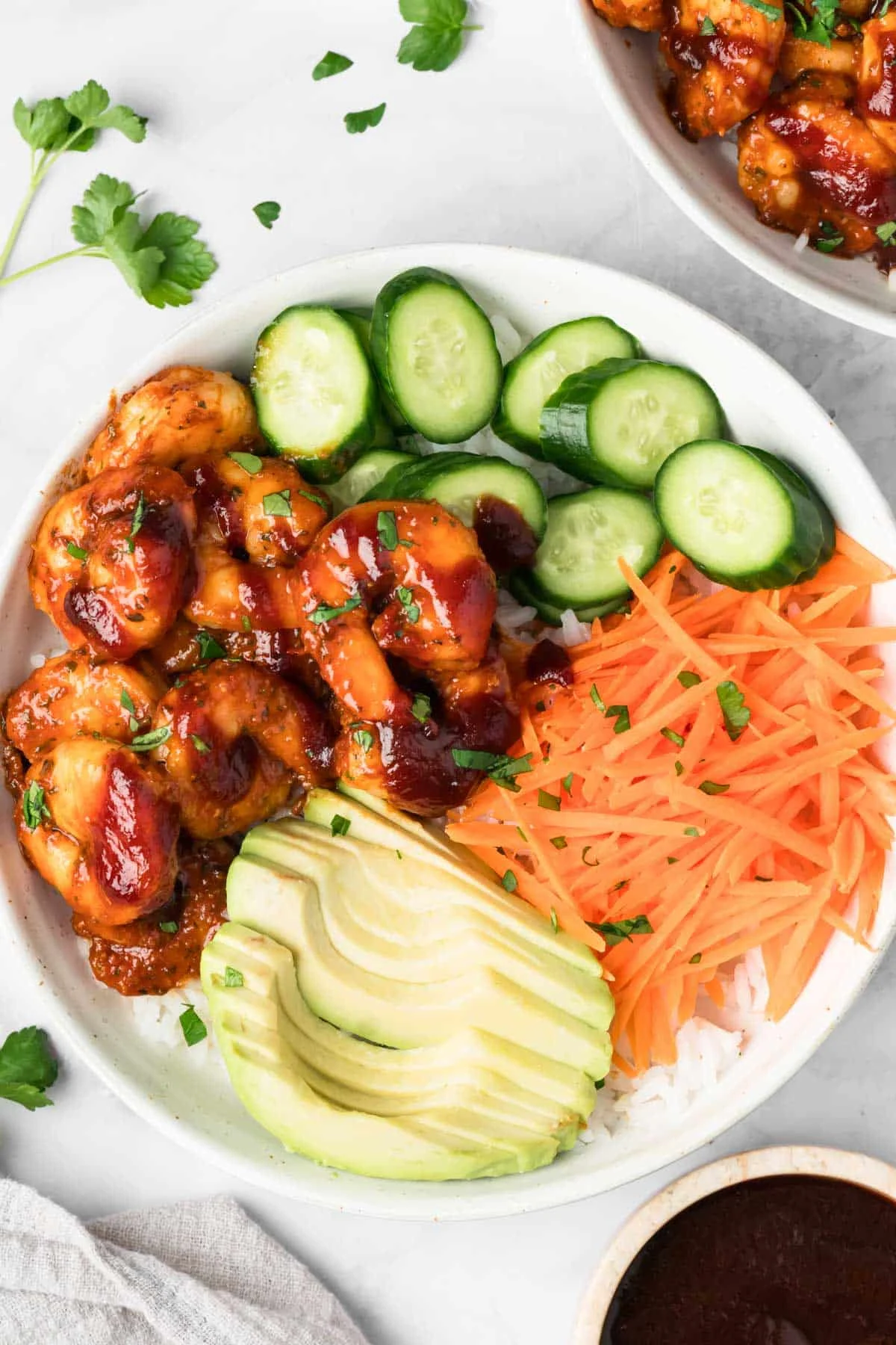 Step 4: Assemble. Divide the rice between bowls and top with the BBQ shrimp, cucumbers, carrots, and avocado. Drizzle more BBQ sauce on top and enjoy!