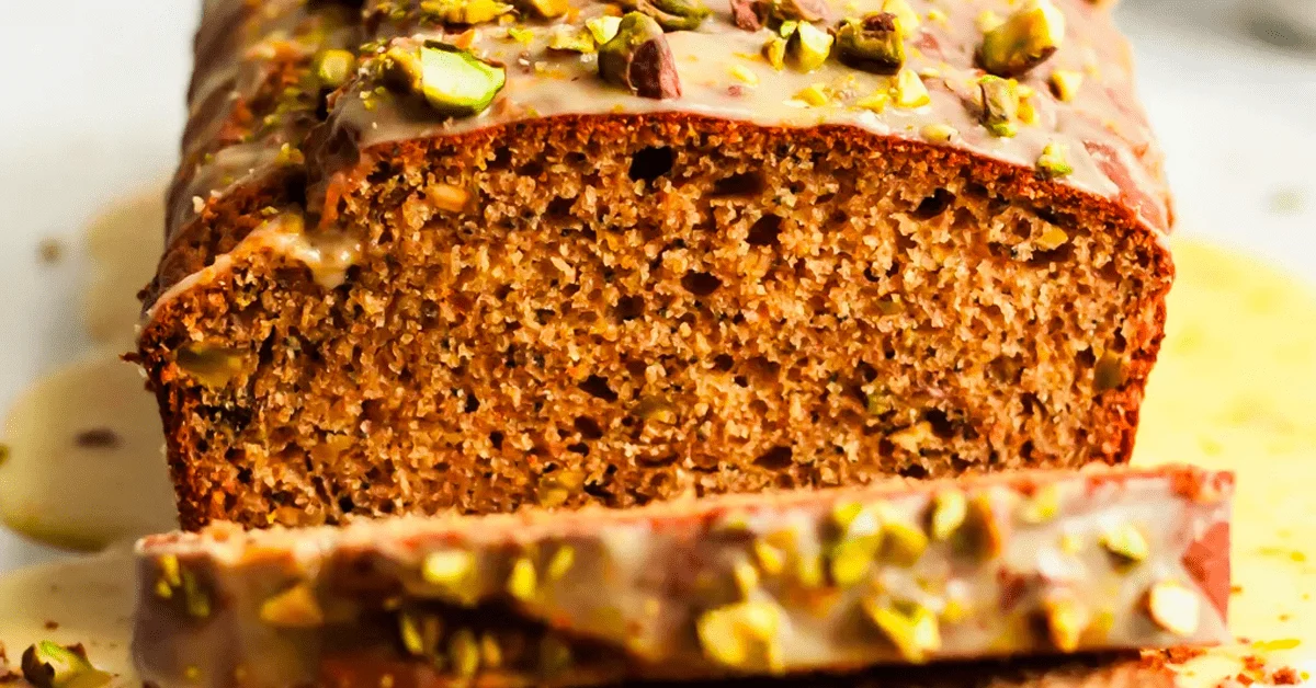 - Glaze, garnish & enjoy. While the bread is cooling, mix the glaze. Spread it over the top of the cooled loaf, garnish with pistachios, and enjoy!