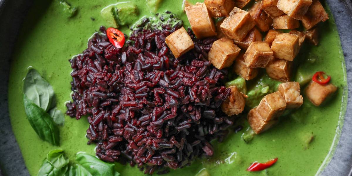 This meal might look fancy (one to bookmark for guests, because it definitely has that wow factor), but it’s surprisingly simple to pull off and totally fits a nourishing weeknight dinner. Store bought green curry paste gives you that restaurant style taste in minutes, while the broth turns vibrant green thanks to a generous handful of spinach and fresh basil blended in for a bright, rounded flavour. I love serving it with black rice for the chewy bite and the gorgeous contrast against the green curry, but brown rice or white rice work beautifully too.