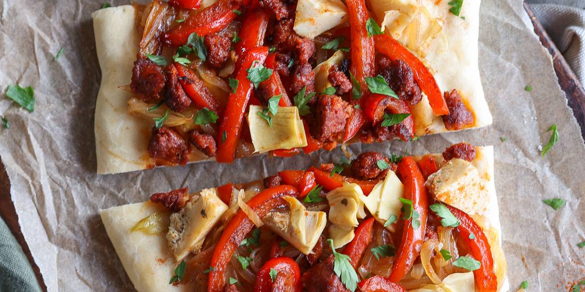 Coca de Recapte, is a traditional dish from Catalonia, a region in northeastern Spain. The name “Coca de Recapte” translates to “collection cake” or “harvest cake”, referring to its origins as a way to use up various ingredients from the pantry or garden. Ours is loaded with vibrant bell peppers, savoury vegan sausage, and tender artichoke hearts.