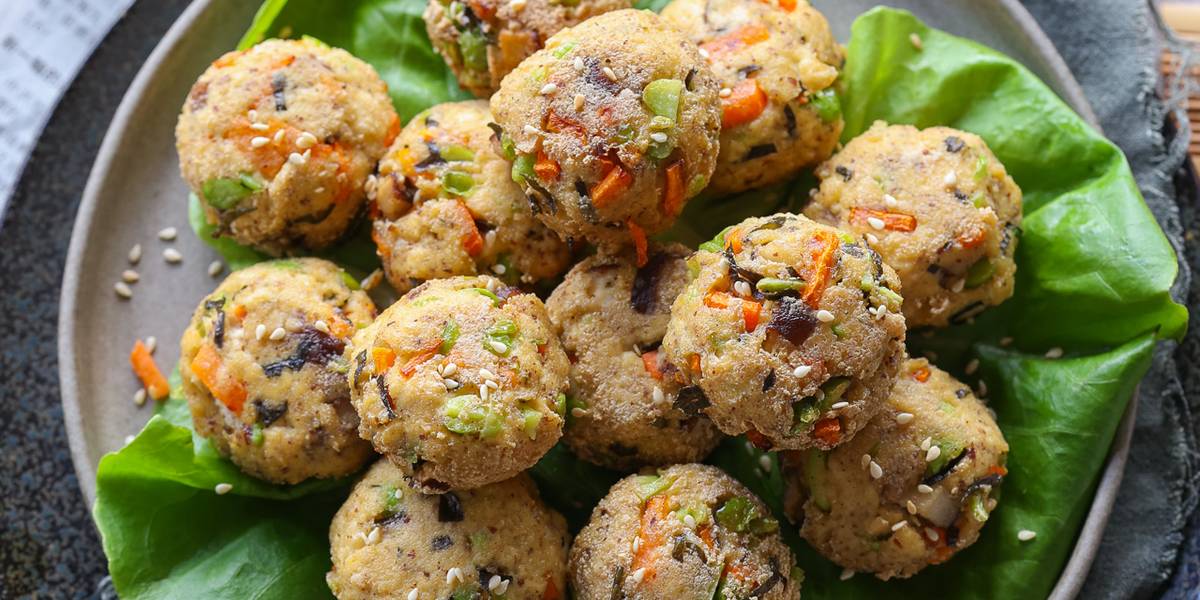 Ganmodoki is a Japanese tofu fritter rooted in Buddhist temple cuisine. Made from mashed tofu mixed with vegetables, ganmodoki has a slightly crispy exterior and a soft, tender interior. Its neutral flavour makes it the perfect canvas for your favourite dipping sauces. Perfect to enjoy as an appetizer, a side dish, or in a bento box.